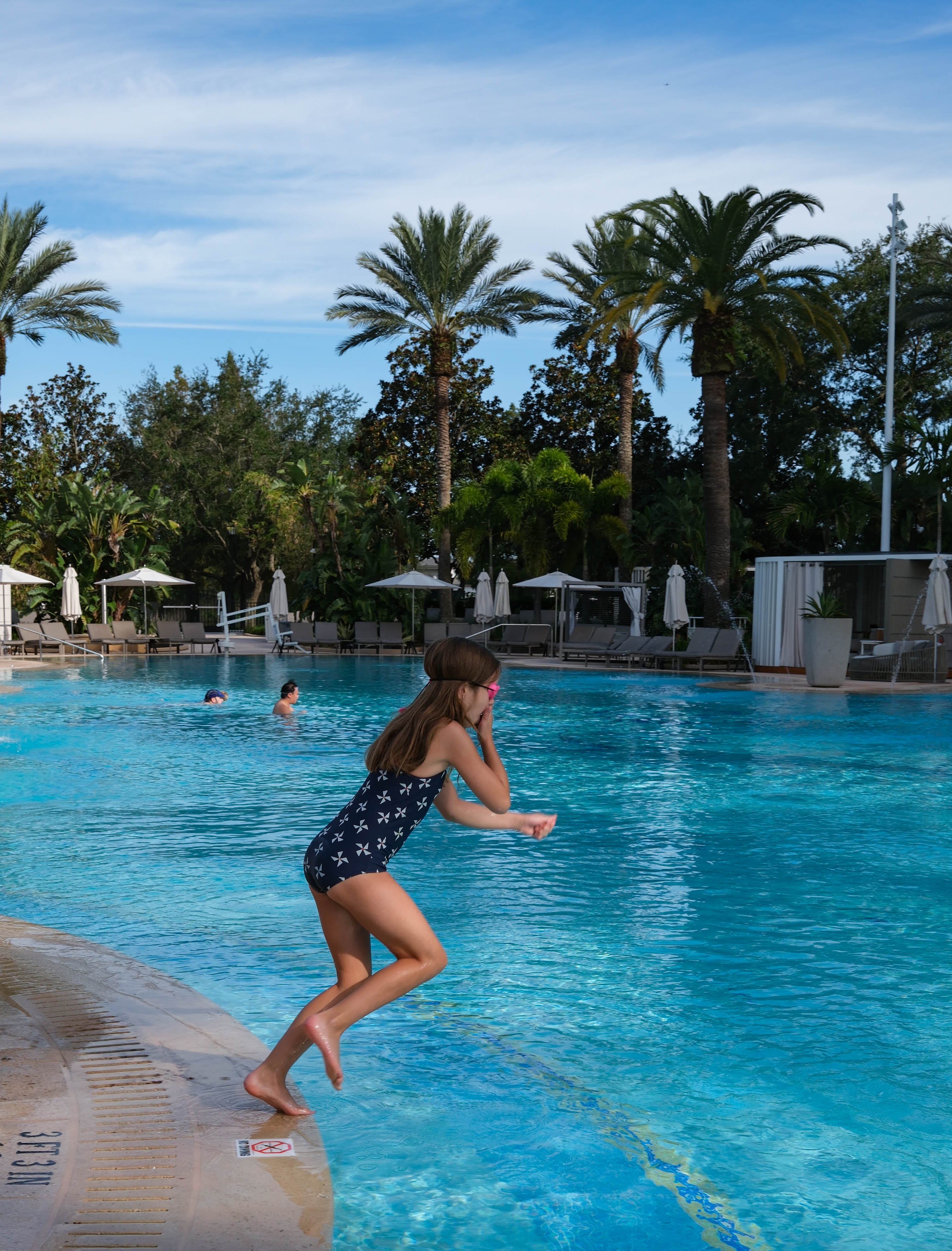 It's our last morning in Florida. The hotel is letting us keep the room until lunch time. That's wonderfully convenient. Outside, it's no longer 100% sunny, but it will be warm. We can have a final swim splurge.