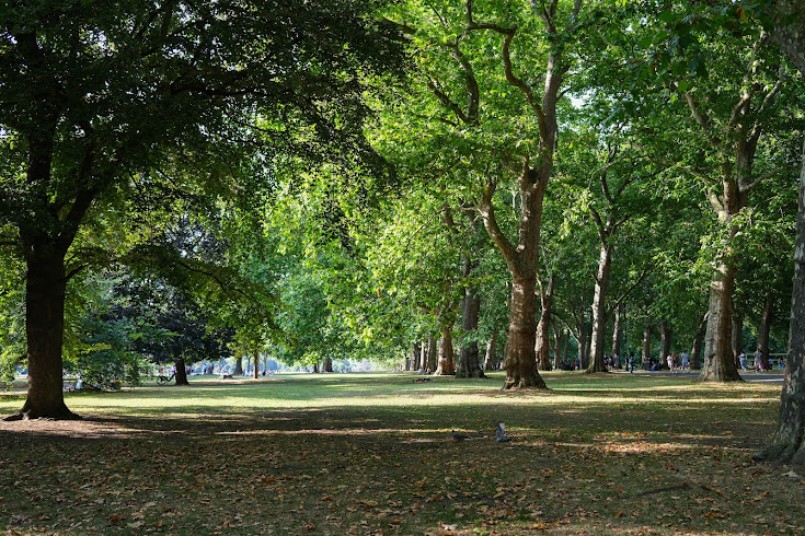 I walked through Hyde Park. It was green. It was loud. It had many bicycles. People seemed happy.