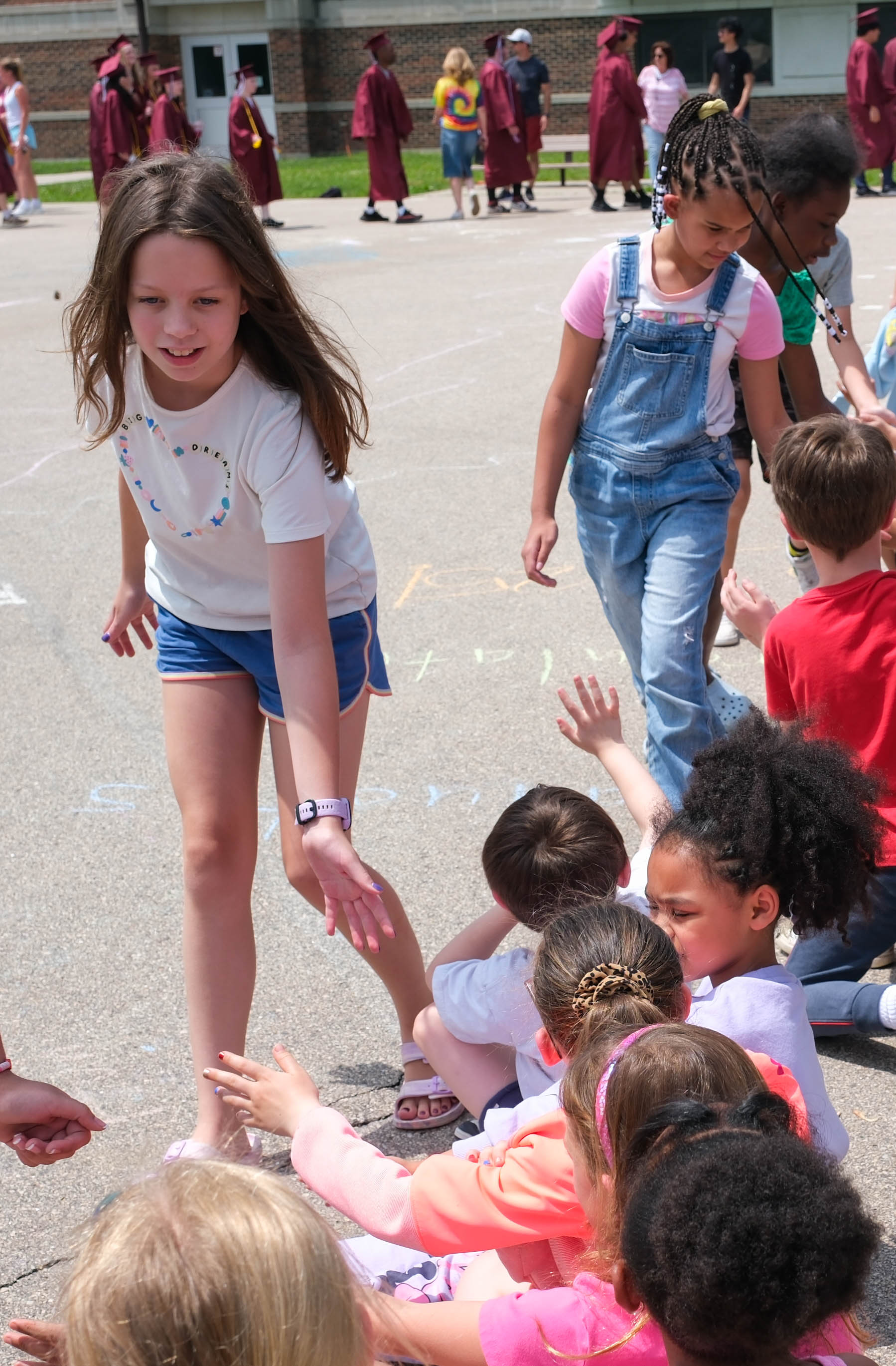 In the first part of the celebration, the High School seniors who attended this elementary school show up and give the little kids high fives.